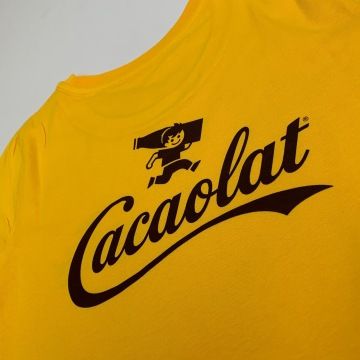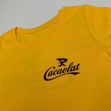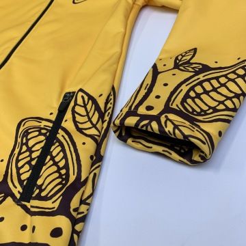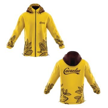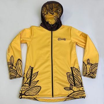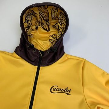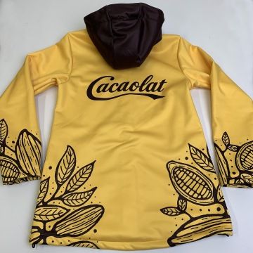 Realizace setu dámských softshellových bund se sublimačním celopotiskem a triček ze 100% organické bavlny pro team Cacaolat včetně návrhu designu ve firemních barvách a motivech.