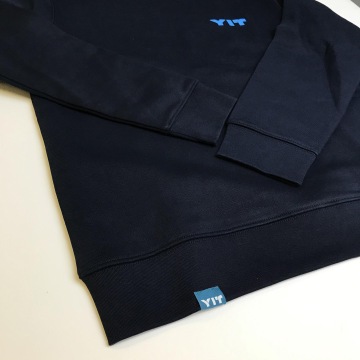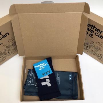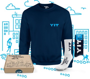 Klient: YIT Česká republika. Zadání: oblečení a doplňky v prémiovém provedení jako vánoční dárek pro zaměstnance. Design: navrhněte a vytvořte sami dle grafických guidelines. Balné: zajímavé balení s důrazem na ekologii. Řešení: Jako hlavní produkt jsme použili crewneck mikiny z organické bavlny a recyklovaného polyesteru od našeho dodavatele Stanley/Stella, které jsme potiskli a našili na ně tkané labely s logem. Namísto PVC pytlíku jsme mikiny jen "opásali" kartonovým přebalem s nalepeným logem. Do kolekce jsme ještě přidali ponožky (pletené u nás v ČR) s přebalem v designu a funkční nákrčník ze 100% polyesteru (také vyrobený u nás). Ponožky a nákrčník jsme vložili do kartonové krabičky s potiskem v hlavním motivu kolekce a celý merch set se krásně vešel do plátěné tašky ze 100% organické bavlny.